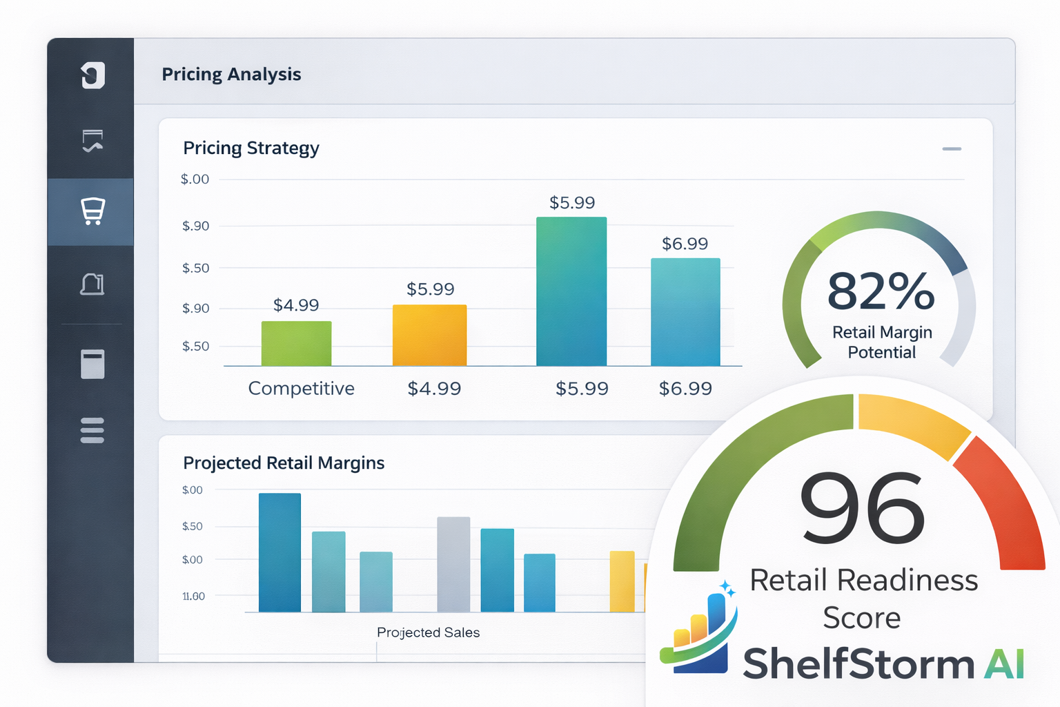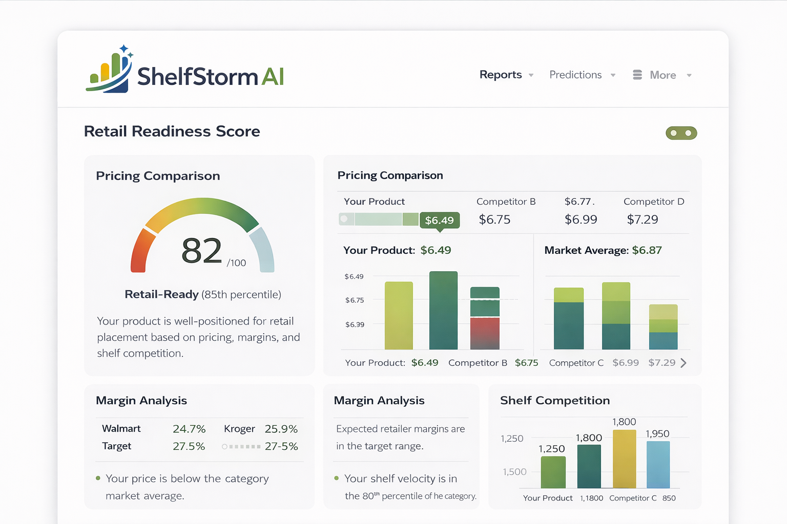 ShelfStorm AI generates a Retail Readiness Score that evaluates how well your product aligns with real retail expectations. The score is calculated using pricing competitiveness, expected retailer margin thresholds, category competition, and projected shelf velocity.